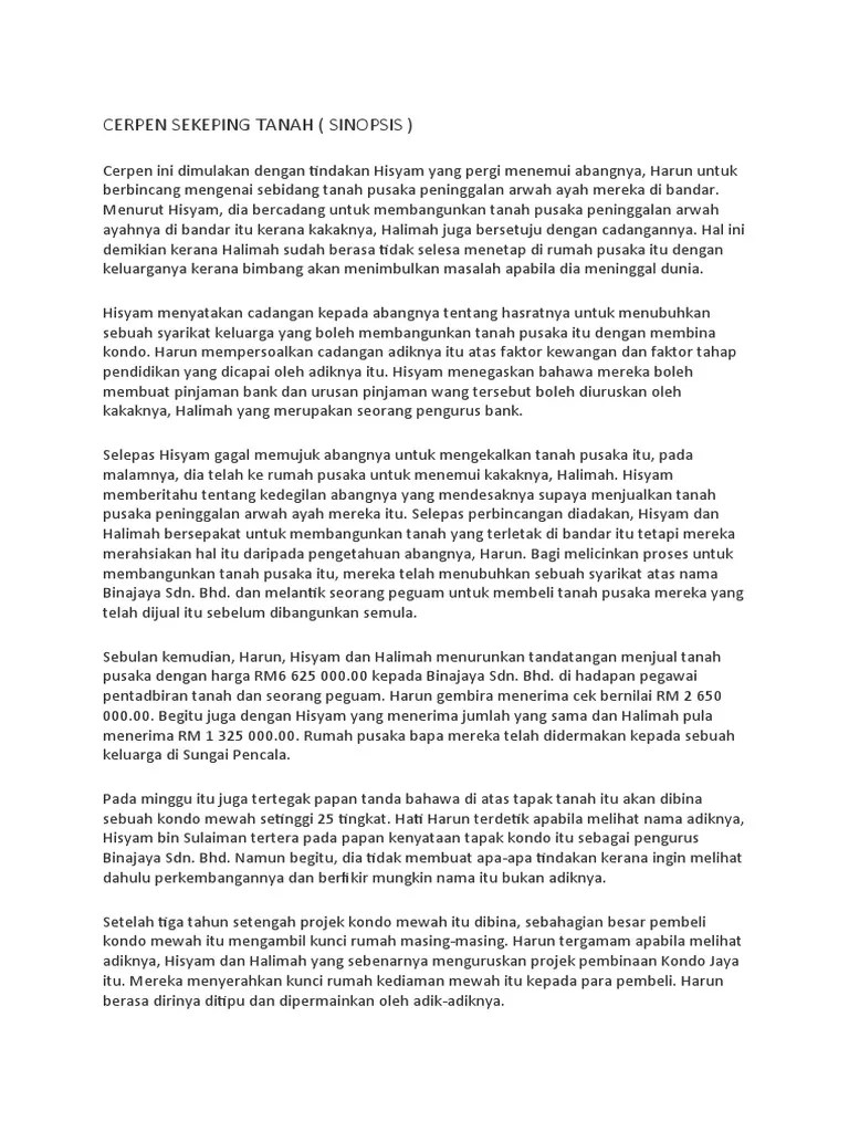 Sinopsis cerpen sekeping tanah cerpen ini dimulakan dengan tindakan hisyam yang pergi menemui abangnya, harun untuk berbincang mengenai .